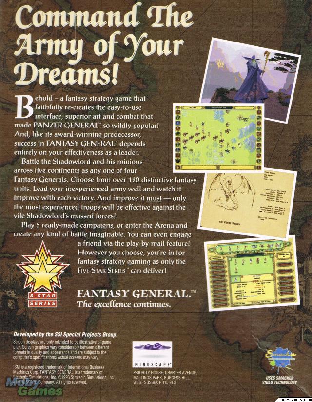 Fantasy General is the follow up title to SSI's successful Panzer General and incorporates many of the same features set in a vastly different environment. In this strategic war game, you assume a leadership role as one of four pre-generated fantasy generals (with the option of customizing your own) to face the potentially destructive challenge of the evil Shadowlord who wants nothing more than to conquer the world of Aer, your homeland, and subjugate the people to a dismal life of oppression under his armies of darkness. Aer's Council of Five has chosen four champions of exceptional ability of which you are the warlord. You create your army of might and magic from more than 120 available fantasy units and can augment your forces with uniquely powerful heroes if you can find them. Then to improve your chances in the final battles you must cultivate experience one battle at a time as you attempt to overthrow the Shadowlord's four lieutenants, each controlling one of the four continents surrounding his fortress on Fire Isle. Fantasy General features five pre-set campaigns as well as a random map generator and the option to create your own battles in the Arena.