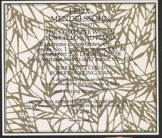 Audiophile series · Digital master. A digital audiophile recording from the studios of the University of Iowa. Total playing time: 65:59. Performers: Terry King, cello; Robert Moeling, piano. Catalog: CD-288.
