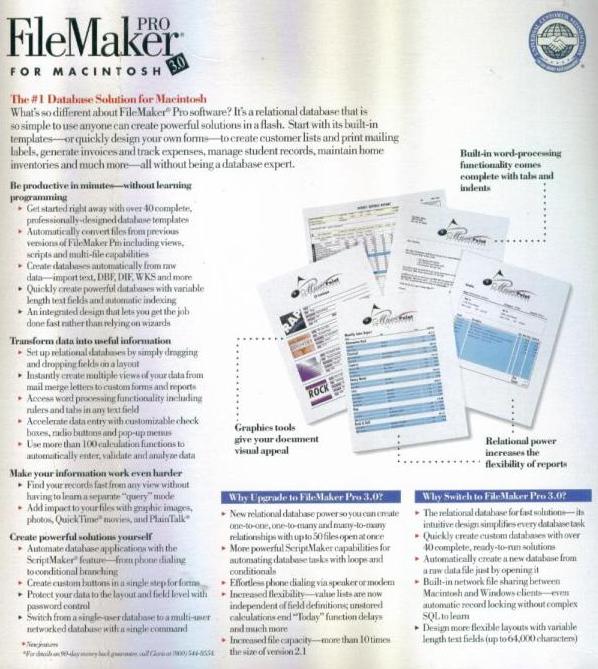 FileMaker Pro 3 is a major improvement over the version it supersedes (2.1). But this is saying too little, because version 3 is not just better, it is, in some fundamental way, a different kind of application. A relational database application differs from a flat-file system at least as much as a page-layout program differs from a word processor. Remarkably, not only does FileMaker Pro retain all of the features of FileMaker Pro 2.1, it actually looks and feels enough like its predecessor that experienced users of the earlier version will find the transition to version 3 effortless.