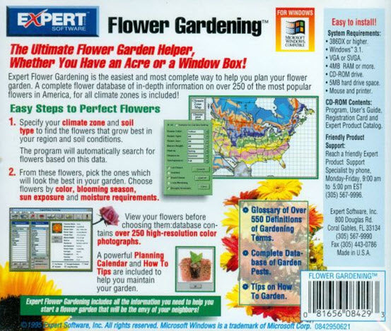 Flower Gardening from Expert Software. Everything you need to grow beautiful flowers! The ultimate flower gardener helper, whether you have an acre or a windows box! Specify your climate zone and soil type to determine the flowers that will grow best in your region and soil conditions. The program will automatically search for flowers based on this data. From the flowers pick the ones which will look best in your garden. Choose flowers by color, blooming season, sun exposure and moisture requirements.