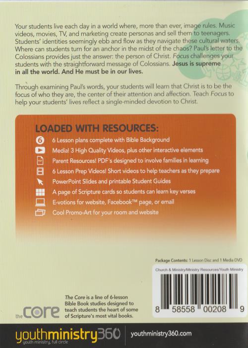 Your students live each day in a world where, more than ever, image rules. Music videos, movies, TV, and marketing create personas and sell them to teenagers. Students' identities seemingly ebb and flow as they navigate these cultural waters. Where can students turn for an anchor in the midst of the chaos? Paul's letter to the Colossians provides just the answer: the person of Christ. Focus challenges your students with the straightforward message of Colossians. Jesus is supreme in all the world. And He must be in our lives. Through examining Paul's words, your students will learn that Christ is to be the focus of who they are, the center of their attention and affection. Teach Focus to help your students' lives reflect a single-minded devotion to Christ. 0 El U. 6 Lesson plans complete with Bible Background Media! 3 High Quality Videos, plus other interactive elements Parent Resources! PDF's designed to involve families in learning 6 Lesson Prep Videos! Short videos to help teachers as they prepare PowerPoint Slides and printable Student Guides A page of Scripture cards so students can learn key verses E-votions for website, FacebookTM page, or email Cool Promo-Art for your room and website
