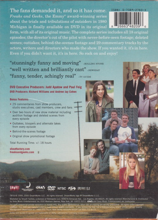 Freaks and Geeks, the Emmy® award-winning series about the trials and tribulations of outsiders in 1980 Michigan, is finally available on DVD in its original form, with all of its original music. The complete series includes all 18 original episodes; the director's cut of the pilot with never-before-seen footage; deleted scenes; outtakes; behind-the-scenes footage and 29 commentary tracks by the actors, writers, and directors who made the show. If you wanted it, it's in here. Even if you didn't want it, it's in here. So rock on and enjoy!