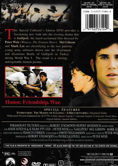 Gallipoli is Australian director Peter Weir's (The Truman Show, Witness) story of how the irresistible lure of adventure and the unknown, combined with national pride, bring two young men (Mel Gibson and Mark Lee) together in the Australian army in 1915. They cross continents and great oceans, climb pyramids and walk through the ancient sands of Egypt to join their regiment at the fateful battle of Gallipoli. The echoes of history blend with the friends' compelling destiny as they become part of a legendary World War 1 confrontation between Australia and the German allied Turks- a battle that is to Australians what the Alamo is to Americans.