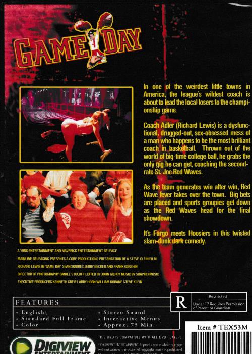 GAME DAY is set in one of the weirdest little towns in America, where the league's wildest coach is about to lead the local losers to the championship game. Coach Adler (Richard Lewis) is a dysfunctional, drugged-out, sex-obsessed mess of a man who happens to be the most brilliant coach in basketball. Thrown out of the world of big-time college ball, he grabs the only gig he can get, coaching the second-rate St Joe Red Waves. As the team generates win after win, Red Wave fever takes over the town. Big bets are placed and sports groupies get down as the Red Waves head for the final showdown. It's Fargo meets Hoosiers in this twisted slam-dunk dark comedy.