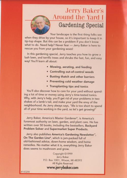 Jerry Baker's Around Iiie Yard I Gardening Special Your landscape is the first thing folks see when they drive by your house, so it's important to keep it in tip-top shape. But this can be a problem if you don't know what to do. Need help? Never fear — Jerry Baker is here to rescue you from your gardening woes! In this gardening special, Jerry teaches you how to grow a lush lawn, and terrific trees and shrubs the fast, fun, and easy way! You'll learn all about: • Mowing, aerating, and feeding • Controlling out-of-control weeds • Busting thatch and other barriers • Preventing cold weather damage • Transplanting tips and tonics You'll also discover how to care for your yard without spend-ing a lot of time or money using Jerry's time-tested tonics. Why, with Jerry's help, you'll get rid of your problems in two shakes of a lamb's tail, and make your yard the envy of the neighborhood. As Jerry always says, "life is too short to spend all of your time working in the yard, so let's get growing!" Jerry Baker, America's Master Gardener, is America's foremost authority on lawn, garden, and plant care. He has written over 50 books, including the bestsellers, Backyard Problem Solver and Supermarket Super Products. Jerry also publishes America's Gardening Newsletter-, On The Garden Line®, which is jam-packed full of old-fashioned advice, down-home wisdom, and home remedies. No matter what it is, everything Jerry Baker does seems to mushroom and grow.