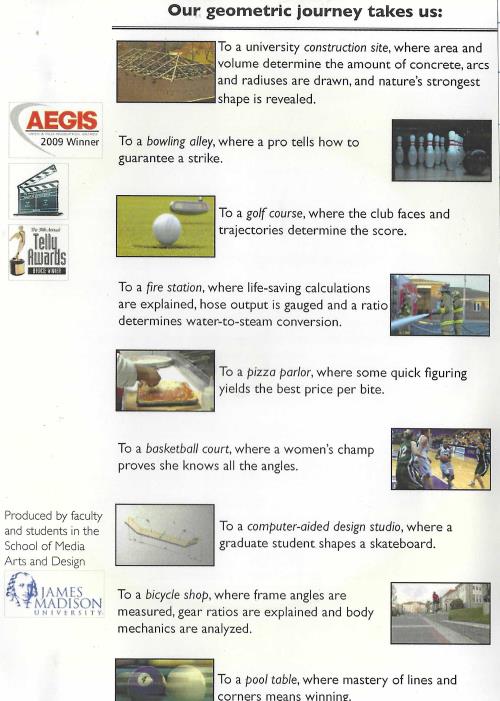 Our geometric journey takes us: AEGIS To a university construction site, where area and volume determine the amount of concrete, arcs and radiuses are drawn, and nature's strongest shape is revealed. 2009 Winner To a bowling alley, where a pro tells how to guarantee a strike. To a golf course, where the club faces and trajectories determine the score. To a fire station, where life-saving calculations are explained, hose output is gauged and a ratio determines water-to-steam conversion. To a pizza parlor, where some quick figuring yields the best price per bite. To a basketball court, where a women's champ proves she knows all the angles. r likta . • To a computer-aided design studio, where a graduate student shapes a skateboard. To a bicycle shop, where frame angles are measured, gear ratios are explained and body mechanics are analyzed. To a pool table, where mastery of lines and corners means winning.