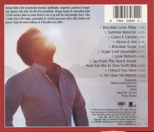 George Duke is the consummate musician: bandleader, songwriter, producer/arranger, and superior solo artist. His music on this compilation blends funky grooves with exotic Brazilian influences, featuring energetic percussion and soulful rhythms. This album invites listeners on a vibrant journey through tropical sounds, combining jazz, funk, and samba elements. Enjoy the rich and captivating blend of lush melodies and rhythmic beats in A Brazilian Love Affair.
