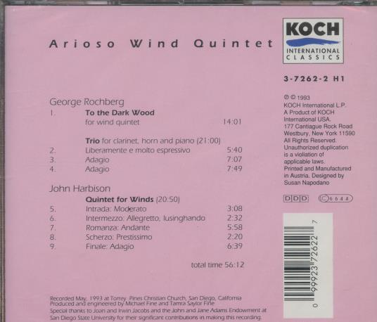 George Rochberg, John Harbison, Arioso Wind Quintet: To The Dark Wood / Trio / Quintet For Winds