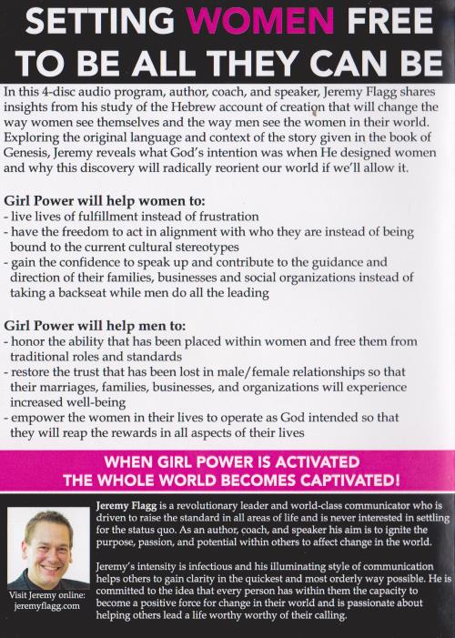 Girl PowerSETTING FREE TO BE ALL THEY CAN BE In this 4-disc audio program, author, coach, and speaker, Jeremy Flagg shares insights from his study of the Hebrew account of creation that will change the way women see themselves and the way men see the women in their world. Exploring the original language and context of the story given in the book of Genesis, Jeremy reveals what God's intention was when He designed women and why this discovery will radically reorient our world if we'll allow it.