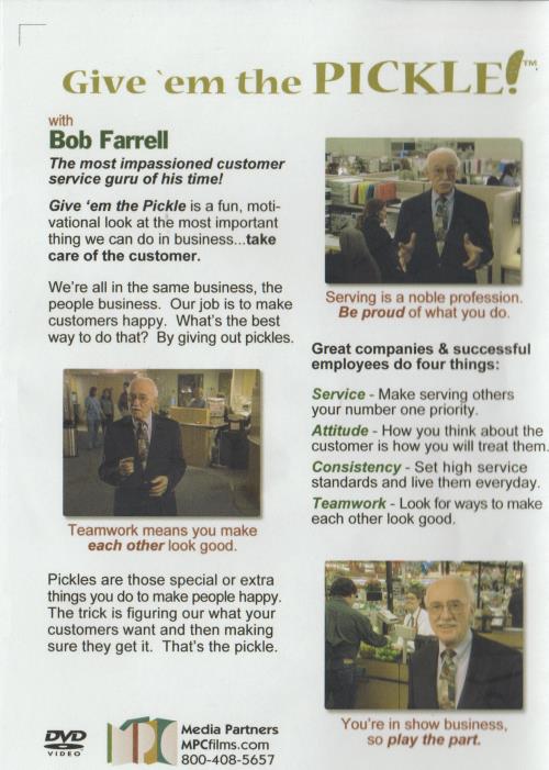 The most impassioned customer service guru of his time! It's a fun, moti-vational look at the most important thing we can do in business...take care of the customer. We're all in the same business, the people business. Our job is to make customers happy. What's the best way to do that? By giving out pickles. Teamwork means you make each other look good. Pickles are those special or extra things you do to make people happy. The trick is figuring our what your customers want and then making sure they get it. That's the pickle. Be proud of what you do Great companies & successful employees do four things: Service - Make serving others your number one priority. Attitude - How you think about the customer is how you will treat them. Consistency - Set high service standards and live them everyday. Teamwork - Look for ways to make each other look good. You're in show business, so play the part. The most impassioned customer service guru of his time!