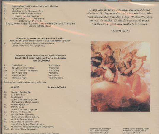 Performers: Los Angeles Byzantine Chorale; Choir of St. Thomas the Apostle Catholic Church; Russian Orthodox Choir of Los Angeles. Director (Russian choir): Vera Iov. Soloists listed on the release include Jaime Chambless (Soprano) and Rachel Evans (Mezzo Soprano). Includes readings from the Gospels of St. Matthew and St. Luke and a full performance of Antonio Vivaldi's Gloria.