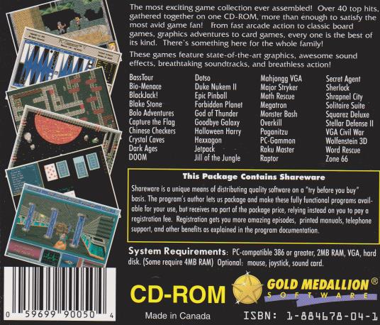 The World's Finesi Shareware for You! The most exciting game collection ever assembled! Over 40 top hits gathered together on one CD-ROM, more than enough to satisfy the most avid game fan! From fast arcade action to classic board games, graphics adventures to card games, every one is the best of its kind. There's something here for the whole family! These games feature state-of-the-art graphics, awesome sound effects, breathtaking soundtracks, and breathless action! BassTour Dotso Mahjongg VGA Secret Agent Bio-Menace Duke Nukem II Major Stryker Sherlock BlackJack! Epic Pinball Math Rescue Shrapnel City Blake Stone Forbidden Planet Megatron Solitaire Suite Bolo Adventures God of Thunder Monster Bash Squarez Deluxe Capture the Flag Goodbye Galaxy Overkill Stellar Defense II Chinese Checkers Halloween Harry Paganitzu VGA Civil War Crystal Caves Hexxagon PC-Gammon Wolfenstein 3D Dark Ages Jetpack Raku Master Word Rescue DOOM Jill of the Jungle Raptor Zone 66 This Package Contains Shareware Shareware is a unique means of distributing quality software on a "try before you buy" basis.