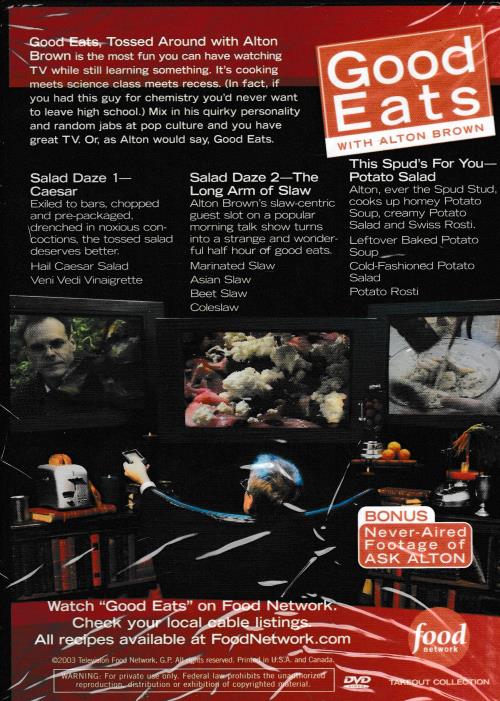 Good Eats With Alton Brown: Tossed Around is the most fun you can have watching TV while still learning something. It's cooking meets science class meets recess. (In fact, if you had this guy for chemistry you'd never want to leave high school.) Mix in his quirky personality and random jabs at pop culture and you have great TV. Or, as Alton would say, Good Eats. Salad Daze 1—Caesar Exiled to bars, chopped and pre-packaged, \drenched in noxious con-.octions, the tossed salad deserves better. Hail Caesar Salad Veni Vedi Vinaigrette WITH ALTON BROWN Salad Daze 2—The Long Arm of Slaw Alton Brown's slaw-centric guest slot on a popular morning talk show turns into a strange and wonder-ful half hour of good eats. Marinated Slaw Asian Slaw Beet Slaw Coleslaw This Spud's For You—Potato Salad Alton, ever the Spud Stud, cooks up homey Potato Soup, creamy Potato Salad and Swiss Rosti. Leftover Baked Potato Soup, Cold-Fashioned Potato Salad Potato Rosti _