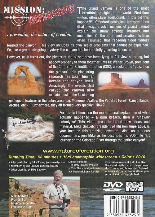 For the first time, see the most rational explanation of what actually happened — a dam breach, then a runaway cataclysm! This video presents brand new ideas and material. Mike Snavely, president of Mission Imperative, is your host on this amazing adventure. Also, as a bonus documentary, join Mike as he describes his 300-mile raft journey on the Colorado River through the entire canyon! Running Time: 53 minutes