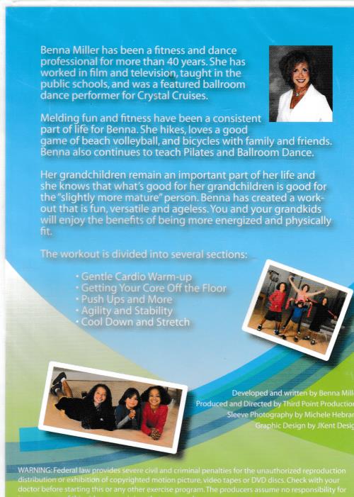 Benna Miller has been a fitness and dance professional for more than 40 years. She has worked in film and television, taught in the public schools, and was a featured ballroom dance performer for Crystal Cruises. Melding fun and fitness have been a consistent part of life for Benna. She hikes, loves a good game of beach volleyball, and bicycles with family and friends. Benna also continues to teach Pilates and Ballroom Dance. Her grandchildren remain an important part of her life and she knows that what's good for her grandchildren is good for the"slightly more mature" person. Benna has created a work-out that is fun, versatile and ageless.You and your grandkids will enjoy the benefits of being more energized and physically fit. The workout is divided into several sections: • Gentle Cardio Warm-up • Getting Your Core Off the Floor • Push Ups and More • Agility and Stability • Cool Down and Stretch