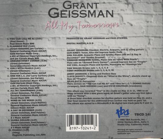 Grant Geissman's "All My Tomorrows" is a musical odyssey that invites listeners into a world of melodic richness and emotional depth. Released as a CD, this album showcases the remarkable talents of the acclaimed guitarist and composer, offering a diverse collection of tracks that span various genres and moods.