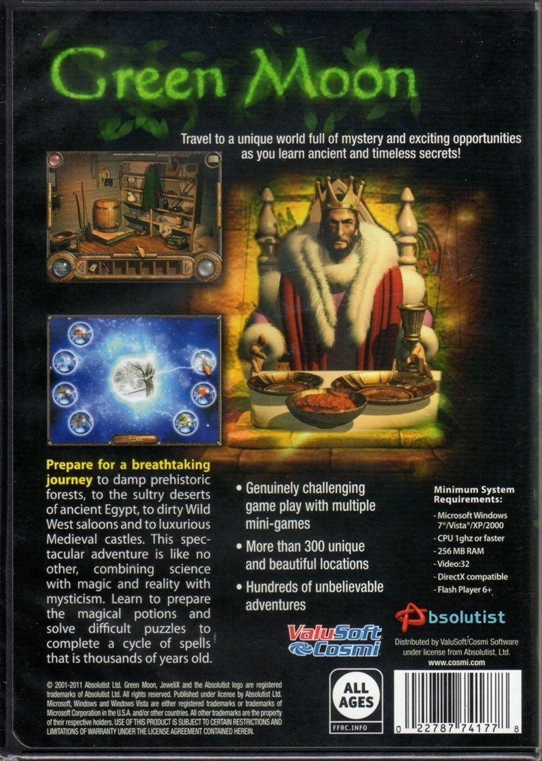 The Cosmi Green Moon is a Hidden object game like no other, combining science with magic and reality with mysticism. Prepare to go on a fantastic journey which will take you from damp prehistoric forests, to the sultry deserts of ancient Egypt, to dirty wild west saloons and luxurious medieval castles.