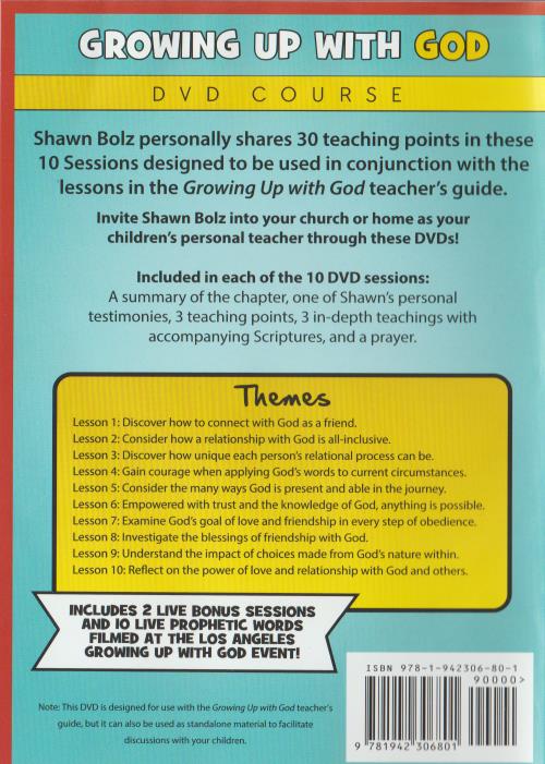 DVD COURSE Shawn Bolz personally shares 30 teaching points in these 10 Sessions designed to be used in conjunction with the lessons in the Growing Up with God teacher's guide. Invite Shawn Bolz into your church or home as your children's personal teacher through these DVDs!