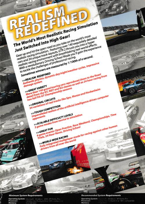 Made to appeal to a wider audience than just the hardcore racing sim fan, this sequel to 2005's indie hit features three difficulty settings and a "Driving School" mode with 45 lessons on braking, acceleration, overtaking, and cornering. After players finish school, they can choose drivers, teams, and circuits licensed from the 2003 and 2004 Federation International de l'Automobile GT Championship seasons, for a total of 34 tracks and 140 vehicle types. Besides "Driving School," GTR 2 includes modes such as "Open Practice," "Race Weekend," "Championships," "Time Trials," and "24 Hour Races." The game's multiplayer modes make room for 32 opponents from around the world, or just a friendly race between friends.