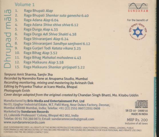Vocal: Umakant Ramakant Gundecha; Pakhawaj: Akhilesh Gundecha. Tanpura: Amit Sharma, Sanjiv Jha. Recorded by Narendra Rane at Anupama Studio, Mumbai. Recording monitoring, mixing and mastering by Avinash Oak. Editing by Priyanka Thakur at Icaro Media, Bhopal. Photograph: Enith. Cover design adapted from the original created by Chandan Singh Bhatti, Mo. Kitabu Uddin. Manufactured by Brio Media and Entertainment Pvt. Ltd. Marketed by Sundaram Records.