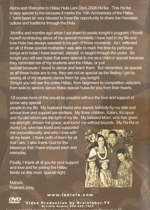 Aloha and welcome to Hālau Hula Lani Ola's 2008 Ho'ike. This Ho'ike is very special because it marks the 10th anniversary of the Hālau. I have been so blessed to have the opportunity to share Hawaiian culture and traditions through the hula.