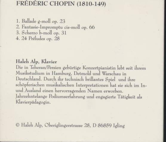 Haleh Alp is a concert pianist born in Tehran, Persia, who studied music in Hamburg, Detmold and Warsaw and is based in Germany. This recording features a program of works by Frédéric Chopin performed with technical brilliance and expressive interpretation. Her playing demonstrates a command of Chopin's Romantic idiom, from dramatic ballades to intimate preludes. Alp has built an excellent reputation at home and abroad, with decades of performance experience and dedicated activity as a piano pedagogue.