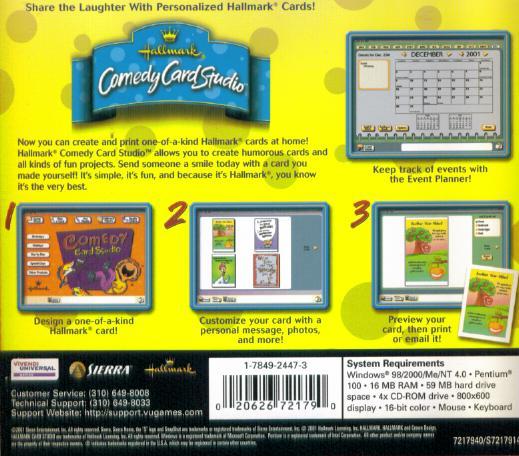 This product offers a funny twist to Hallmark's popular greeting card software. It includes over 500 all-new comedy cards, 500-plus funny Hallmark sentiments, 3,000 art images, and 20-plus exclusive fonts to create greeting cards from your home computer. The fun and easy-to-use interface allows beginners and experts alike to personalize cards in three simple steps: select, customize, and print. You can easily keep track of important dates with the Hallmark event planner and reminder system. Hallmark Comedy Card Studio is fast, easy, and funny.