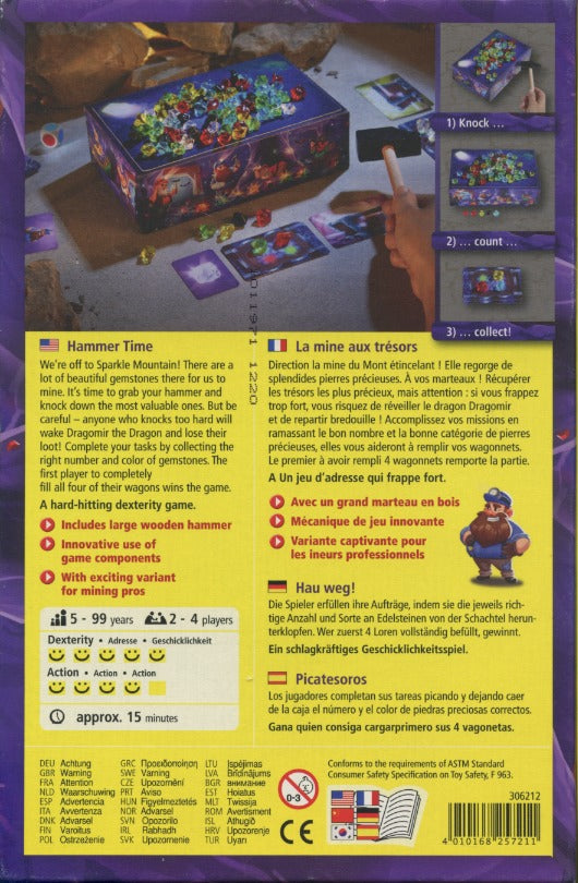 Knock shiny gemstones off the box using the hammer to collect just the right number and color stones. But be careful - knock too hard and you'll awaken Dragomir the Dragon and lose your loot! Be the first player to fill all four of your wagons and you win.