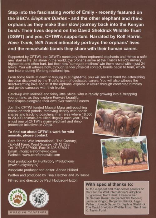 Step into the fascinating world of Emily - recently featured on the BBC's Elephant Diaries - and the other elephant and rhino orphans as they make their slow journey back into the Kenyan bush. Their lives depend on the David Sheldrick Wildlife Trust (DSWT) and you, CFTWI's supporters. Narrated by Rolf Harris, Have Trunk, Will Travel intimately portrays the orphans' lives and the remarkable bonds they share with their human carers.