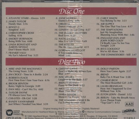 1. MIKE AND THE MECHANICS The Living Years 5:302. JIM CROCE Time In A Bottle 2:243. ROBERTA FLACK First Time Ever I Saw Your Face 4:164. BROOK BENTON Rainy Night In Georgia 3:495. DAN HILL Can't We Try 4:026. TAYLOR DAYNE I'll Always Love You 4:187. CHI-LITES Oh Girl 3:288. RANDY VANWARMER Just When I Needed You Most 3:599. CRYSTAL GAYLE Don't It Make My Brown Eyes Blue 2:3210. NEIL SEDAKA Laughter In The Rain 3:3711. BREWER & SHIPLEY One Toke Over The Line 1:2212. BLUES TRAVELER Hook 4:5413. JAMES TAYLOR Shower The People 3:5314. THE SPINNERS Could It Be I'm Falling In Love 4:1015. DOLLY PARTON Here You Come Again 2:5716. BREAD Baby I'm A Want You 2:2817. CHARLIE RICH The Most Beautiful Girl 2:4218. LAURA BRANIGAN How Am I Supposed To Live Without You 4:5619. ELTON JOHN Daniel 3:5220. BERLIN Take My Breath Away (Love Theme From "Top Gun") 4:12