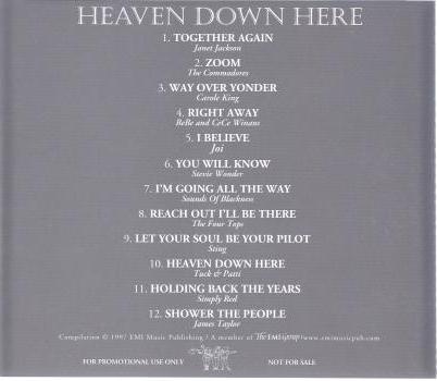 1. TOGETHER AGAIN Janet Jackson 2. ZOOM The Commodores 3. WAY OVER YONDER Carole King 4. RIGHT AWAY BeBe and CeCe Winans 5. I BELIEVE Joi 6. YOU WILL KNOW Stevie Wonder 7. I'M GOING ALL THE WAY Sounds Of Blackness 8. REACH OUT I'LL BE THERE The Four Tops 9. LET YOUR SOUL BE YOUR PILOT Sting 10. HEAVEN DOWN HERE Tuck 6' Patti 11. HOLDING BACK THE YEARS Simply Red 12. SHOWER THE PEOPLE James Taylor