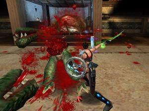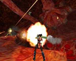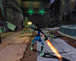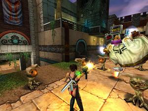 Based on the original movie, Heavy Metal F.A.K.K. 2 adds a new adventure for the warrior Julie Strain. The game is single player and takes place within a 3D interactive environment in which you control Julie and all her weaponry. Two meters reflect your strength during the game: health (red) and water (blue). The health meter is replenished as you pick up health vials and plants. The amount of water you have determines how far you can jump and your strength. The more Eden water you have, the better off you'll be. You can pick up water ampoules and vials along the way to restore your water meter.