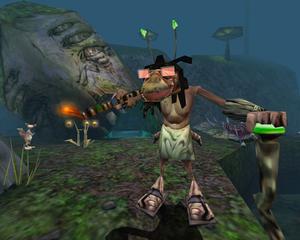 Three different types of armor exist in Heavy Metal F.A.K.K. 2: shoulder, forearm and knee. Each armor piece will reduce the damage the hero takes by a small amount and each new piece of armor unlocks different combination attacks that she uses. Seven item types can be collected throughout the game. Water ampoules and health plants as well as water and health vials contribute toward the overall health and strength of Julie Strain. Sucknblaugh Juice repels flesh eating Suckenblaugh plants and quest items used to solve puzzles or open doors are discovered throughout the adventure. Mysterious Tiki Heads contain secrets that must be unlocked with various Tiki Runes Julie finds during the game.