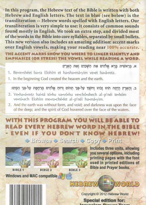 In this program, the Hebrew text of the Bible is written with both Hebrew and English letters. The text in blue (see below) is the transliteration -- Hebrew words spelled with English letters. Our transliteration is very simple to use: it consists of common sounds found mostly in English. We took an extra step, and divided most of the words in the Bible into core syllables, separated by small bullets. This new version also includes an amazing addition: accent marks over English vowels, making your reading near 100 percent accurate. THE ACCENT MARKS SHOW YOU WHERE TO LINGER SLIGHTLY AND EMPHASIZE (OR STRESS/ THE VOWEL WHILE READING A WORD.