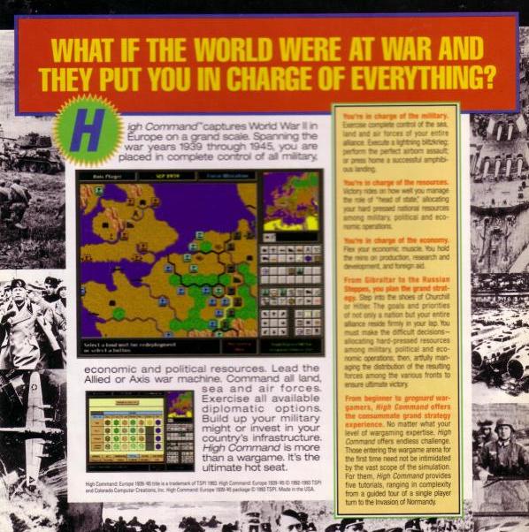 High Command is a strategic-level strategy game that places you in the role of leader of either the Allied or Axis High Command in Europe during WWII. As a leader of your High Command you will have to make numerous political, economic and military decisions in your attempt to achieve your war aims.