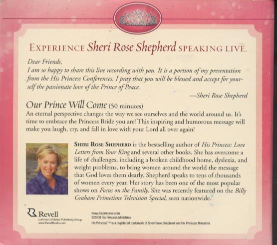 Sheri Rose Shepherd is the bestselling author of His Princess: Love Letters from Your King and several other books. She has overcome a life of challenges, including a broken childhood home, dyslexia, and weight problems, to bring women around the world the message that God loves them dearly. Shepherd speaks to tens of thousands of women every year. Her story has been one of the most popular shows on Focus on the Family. She was recently featured on the Billy Graham Primetime Television Special, seen nationwide.