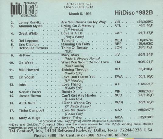 HitDisc 982B is a compilation album featuring a diverse selection of popular tracks from various artists across genres including pop, rock, and R&B. Released in 1993, this album showcases radio-friendly hits that were widely played at the time.