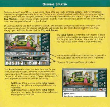 Hollywood High is a creative writing game released in 1996 by Theatrix Ineractive. It is also the sequel to Theatrix's Hollywood, which featured only animal cartoon characters. The game features 37 scenes to be chosen from, as well as multiple human cartoon characters. Users input text and can watch the characters read it. Hollywood High features nine teen-age characters (four boys and five girls), a mother, an athletic coach and a baby sibling. The characters include: