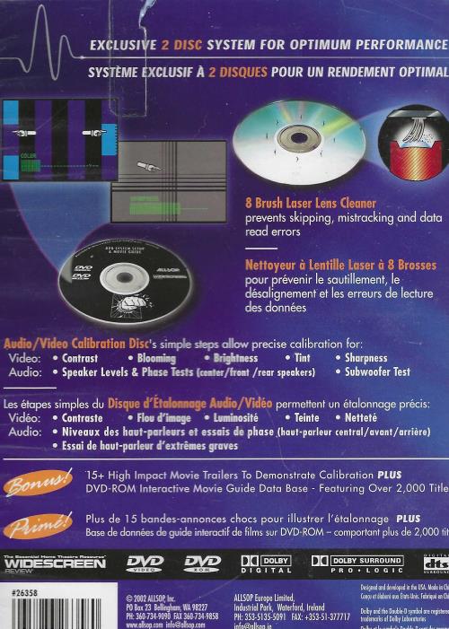 8 Brush Laser Lens Cleaner prevents skipping, mistracking and data read errors Nettoyeur a Lentille 'oser a 8 Brasses pour prevenir le sautillement, le desalignement et les erreurs de lecture des donnees Aapo/Video Calibration Disc's simple skips allow precise calibration for: Video: • Contrast • Bl000lig • Briskeess • Tint • Sharpness Audio: • Speaker Levels & Phase Tests kenter/(ront /rear speakers) • Subwoofer Test Les &apes simples du Disque d'italoormsge :Vick; permettent un etalonnage precis: Video: • Contraste • Floe romp • Luminosite • Teinte • Nettete Audio: • Niveaux des haut-parleers et essais de phase ,(haut-parleur central/avant/arriere) • Essai de haut-parleur d'extremes graves 15+ High Impact Movie Trailers To Demonstrate Calibration PLUS DVD-ROM Interactive Movie Guide Data Base - Featuring Over 2,000 Titles Plus
