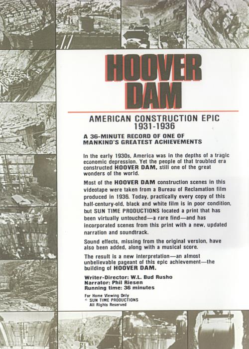 Most of the Hoover Dam construction scenes in this videotape were taken from a Bureau of Reclamation film produced in 1936. Today, practically every copy of this half-century-old, black and white film is in poor condition, but Sun Time Productions located a print that has been virtually untouched—a rare find—and has incorporated scenes from this print with a new, updated narration and soundtrack.