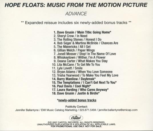 Hope Floats: Music From The Motion Picture Advance Promo w/ Back Artwork