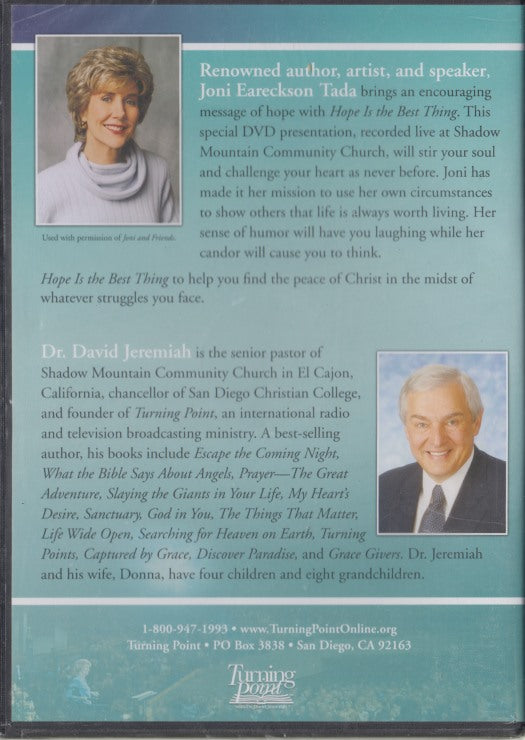 Renowned author, artist, and speaker Joni Eareckson Tada brings an encouraging message of hope with Hope Is the Best Thing. This special DVD presentation, recorded live at Shadow Mountain Community Church, will stir your soul and challenge your heart. Joni has made it her mission to use her own circumstances to show others that life is always worth living. Her sense of humor will have you laughing while her candor will help you find the peace of Christ in the midst of whatever struggles you face.