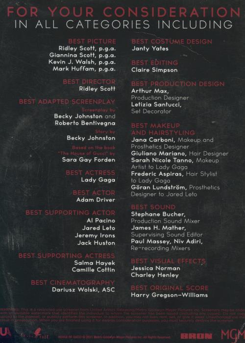 House Of Gucci FYC BLU-RAY VIDEO MOVIE Ridley Scott Lady Gaga high fashion RARE