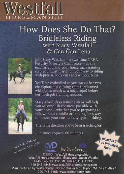 Presents: How Does She Do That? fix Bridleless Riding with Stacy & Can Can Lena Step-by-step training to help you refine your riding cuesHow Does She Do That? Bridleless Riding with Stacy & Can Can Lena Join Stacy — a two-time NRHA Futurity Freestyle Champion— as she teaches you and your horse each training step you must master on your way to riding with precise body cues and without reins. You'll be enthralled as you watch her two championship-earning runs (performed without so much as a neck rope) before her in-depth training session. Stacy's bridleless training steps will help you accomplish the most possible with your horse—whether you're preparing to ride without a bridle or looking for a way to master your cues for any type of riding. This is the direction you've been searching for! Run time: approx. 60 minutes