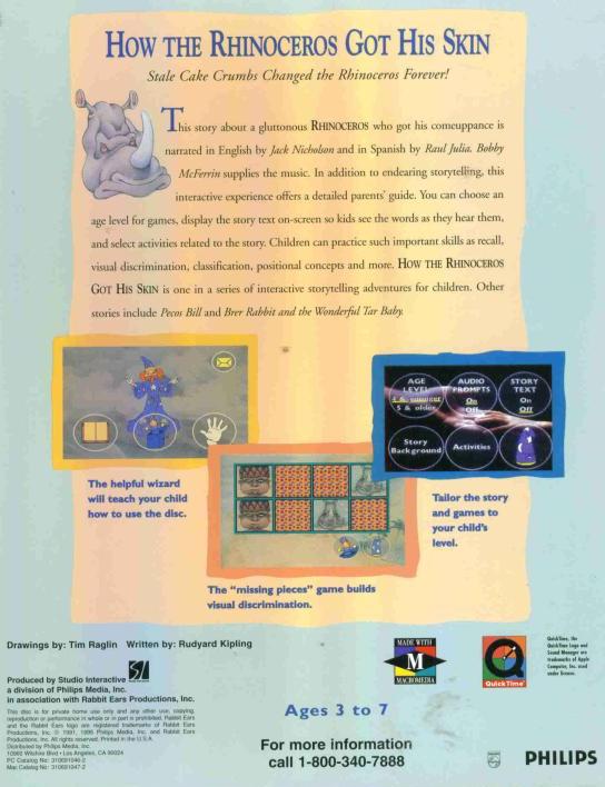 This story about a gluttonous RHINOCEROS who got his comeuppance is narrated in English by Jack Nicholson and in Spanish by Raul Julia. Bobby McFerrin supplies the music. In addition to endearing storytelling, this interactive experience offers a detailed parents' guide. You can choose an age level for games, display the story text on-screen so kids see the words as they hear them, and select activities related to the story. Children can practice such important skills as recall, visual discrimination, classification, positional concepts and more.