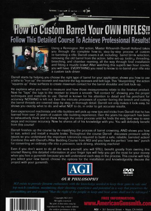 How To Custom Barrel Your OWN RIFLES!! Follow This Detailed Course To Achieve Professional Results! Using a Remington 700 action, Master Riflesmith Darrell Holland takes you through the complete how-to, step-by-step process of custom re-barreling a rifle. Darrell covers it all, including: barrel blank selection, removing the old barrel from the action, lathe set-up, toolinj, threading, breeching, and chamber reaming, all the way through final installation and fitting a muzzle brake! After watching this superb two hour course, you will have EVERYTHING you need to know to re-barrel your rifle into a custom tack-driver. Darrell starts by helping you choose the right type of barrel for your application, shows you how to use a lathe to "true up" the receiver and machine the lug recesses and bolt lugs. This "blueprinting" the action "squares up" these surfaces to create maximum contact for the barrel shoulder and bolt lock-up. He explains what you need to measure and how those measurements relate to the finished product. Next he laps" the lugs to the receiver to insure a smooth "full contact fit", showing you the proper techniques and materials to use. Darrell is known for his attention to detail and his penchant for accuracy. NOTHING is left out. Even the intricate processes of counter-boring the breech and cutting the barrel threads are covered step-by-step, in thorough detail. Darrell not only makes it look easy, he shows you exactly what to do, and what NOT to do, in order to get accurate results. Even experienced machinists and rifle-builders will pick up new tips and tricks from Darrell that he has learned from over 25 years of custom rifle-building experience. Over the years his approach has been to exhaustively think and re-think through the entire process until he finds the very best way to save steps and increase accuracy. Now he shares all of his knowledge with you. You will definitely benefit from this course! Darrell finishes up the course by de-mystifying the process of barrel crowning, AND shows you how to size, select and install a muzzle brake. Throughout the course Darrell discusses pressure safety issues so you understand the important tolerances required to build a safe, reliable, barreled action! Combine this with Darrell's Pillar Bedding Course from AGI and you have the perfect "one-two" punch for converting an ordinary rifle into a precision, tack-driving, shooting machine! Even if you don't want to do all the work yourself, you will STILL benefit greatly from owning this course! Having this detailed information at your finger tips will help you get the most for your money when you hire a gunsmith because you will understand each step in the process. This course will help you select your new barrel, choose the options for the installation and knowledgeably discuss the project with your gunsmith.