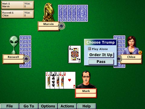 This 2002 edition of Sierra's Hoyle Card Games features virtual versions of international classics, including Bridge, Canasta, Crazy Eights, Cribbage, Euchre, Gin Rummy, Go Fish, Hearts, Memory Match, Old Maid, Pinochle, Pitch, Poker, Skat, Spades, Tarot, and War. Fifty different solitaire games are also included. Two bonus games, Solitaire and Spades, are also available for play on Palm OS and Windows CE PDA handhelds. Players can design their own representative in-game characters then challenge their friends or a variety of computer opponents. Up to four gamers can compete on the same computer and online multiplayer options are also supported, including free Internet play.