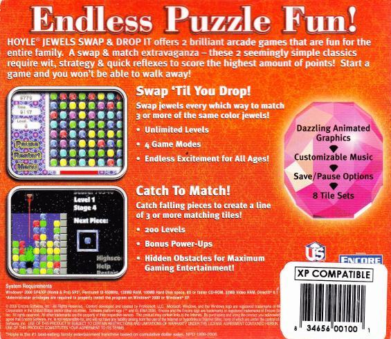 Hoyle Jewels: Swap & Drop It features two games in one package. Players may test their skills at "Swap Till You Drop," and "Catch Till You Match." In "Swap," gamers must match up jewels in every direction to clear the level. The game features four different modes and an unlimited amount of levels. "Catch" involves grabbing falling pieces and matching them with blocks of the same color. Players may try their luck in over 200 levels of gameplay that feature bonus power-ups and hidden obstacles.