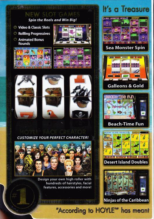 The gambling specialists at Encore Software bring gamers 25 all-new, pirate-themed slot machines in Hoyle Swashbucklin' Slots. The selection includes 20 video slots and five machine slots, with the video slots like "Beijing Buckaneers," "Ninjas on the Caribbean," and "Poseidon's Plunder" offering as many as 20 different paylines. Each machine features unique sound effects, and players can use the Face Creator feature to customize their avatar's facial features and outfit.