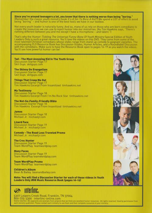 Since you're around teenagers a lot, you know that there is nothing worse than being "boring." (Remember the classic youth ministry book It's A Sin To Bore A Kid?J We spend a LOT of eflor t to ovoid being -boring" - and humor is one of the best tools we have in our toolbox. Not every youth leader is naturally funny. And so, many of us rely on those who are born comedian•. H create the resources we can use to inject humor into our ministries. (As Tim Hawkins says, "Theo. •. nothing different between you and me except I have a microphone - and talent.") That's why the Humor: Tickling The Universal Funny-Bone Of Youth Ministry Special Edition of Youth Leaders Only is such a great resource. You'll love the videos on this DVD. They come from some of II, most talented Christian comedians whose styles range from stand-up comedy to poignant vignette••